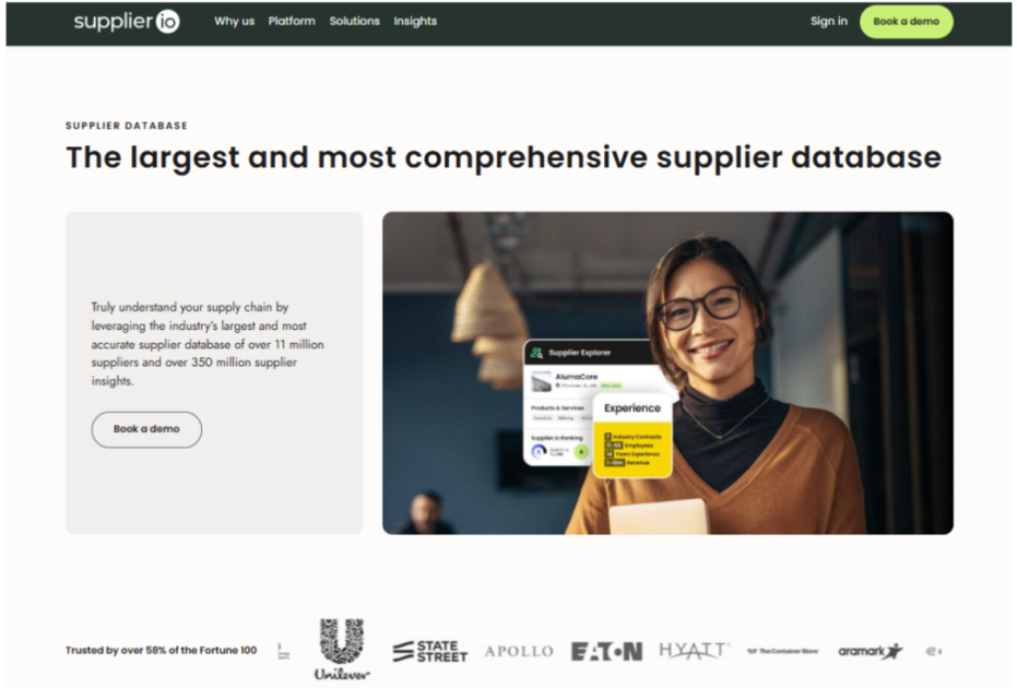 Supplier.io’s supplier directory helps teams manage vendors efficiently and ensure data accuracy across operations. With more than 11 million suppliers and 350 million data points, it supports identifying diverse, small, and sustainable suppliers.